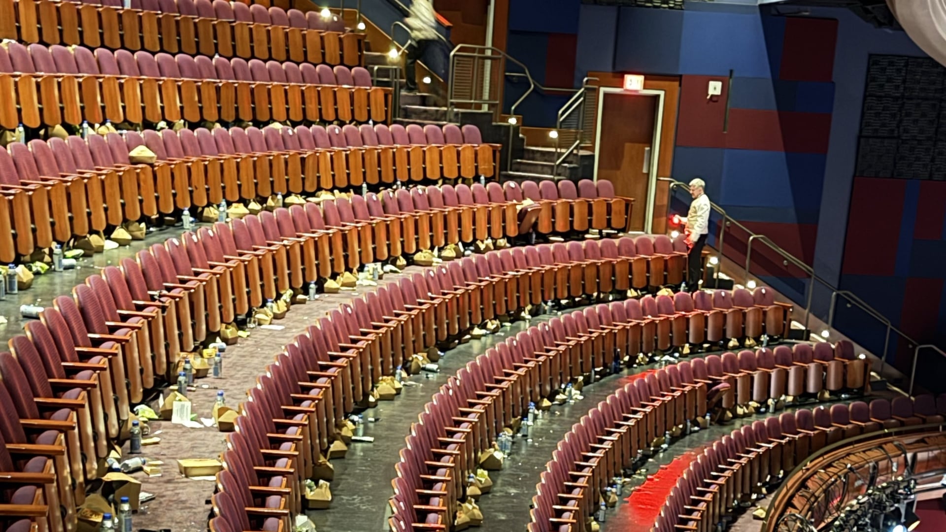 Na foto publicada pelo proprietário e editor-chefe do site Next Best Picture, é possível ver o chão tomado por garrafas plásticas, copos e embalagens de comida espalhadas pelos corredores do teatro.