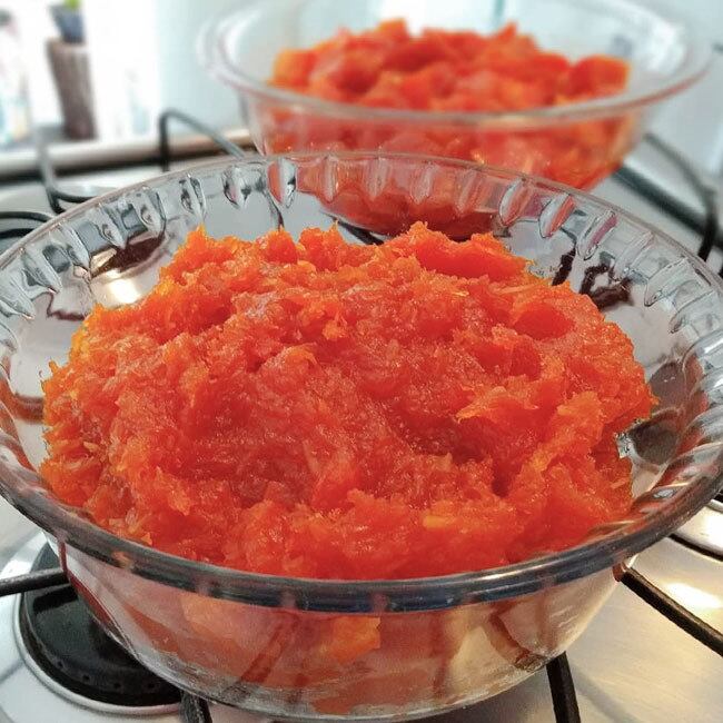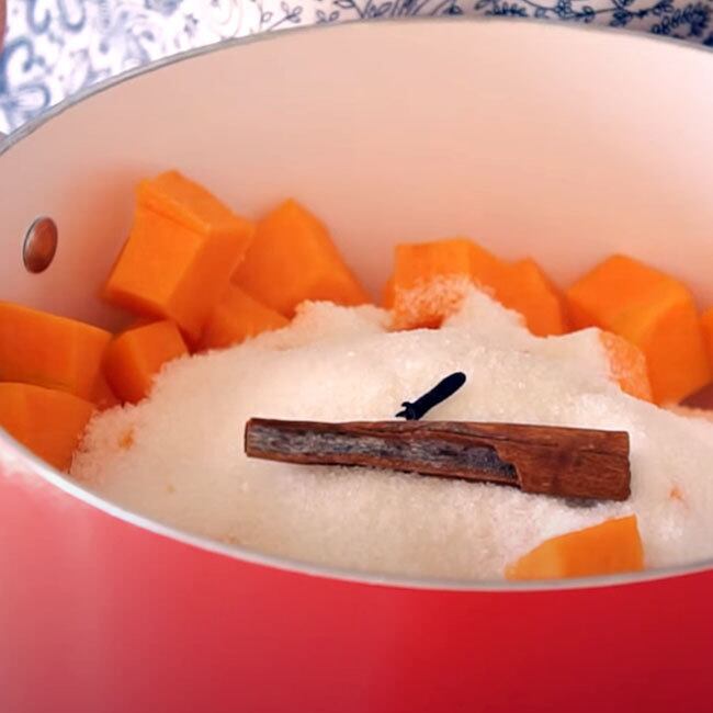 Em uma panela, coloque o jerimum, o açúcar, a canela e o cravo;