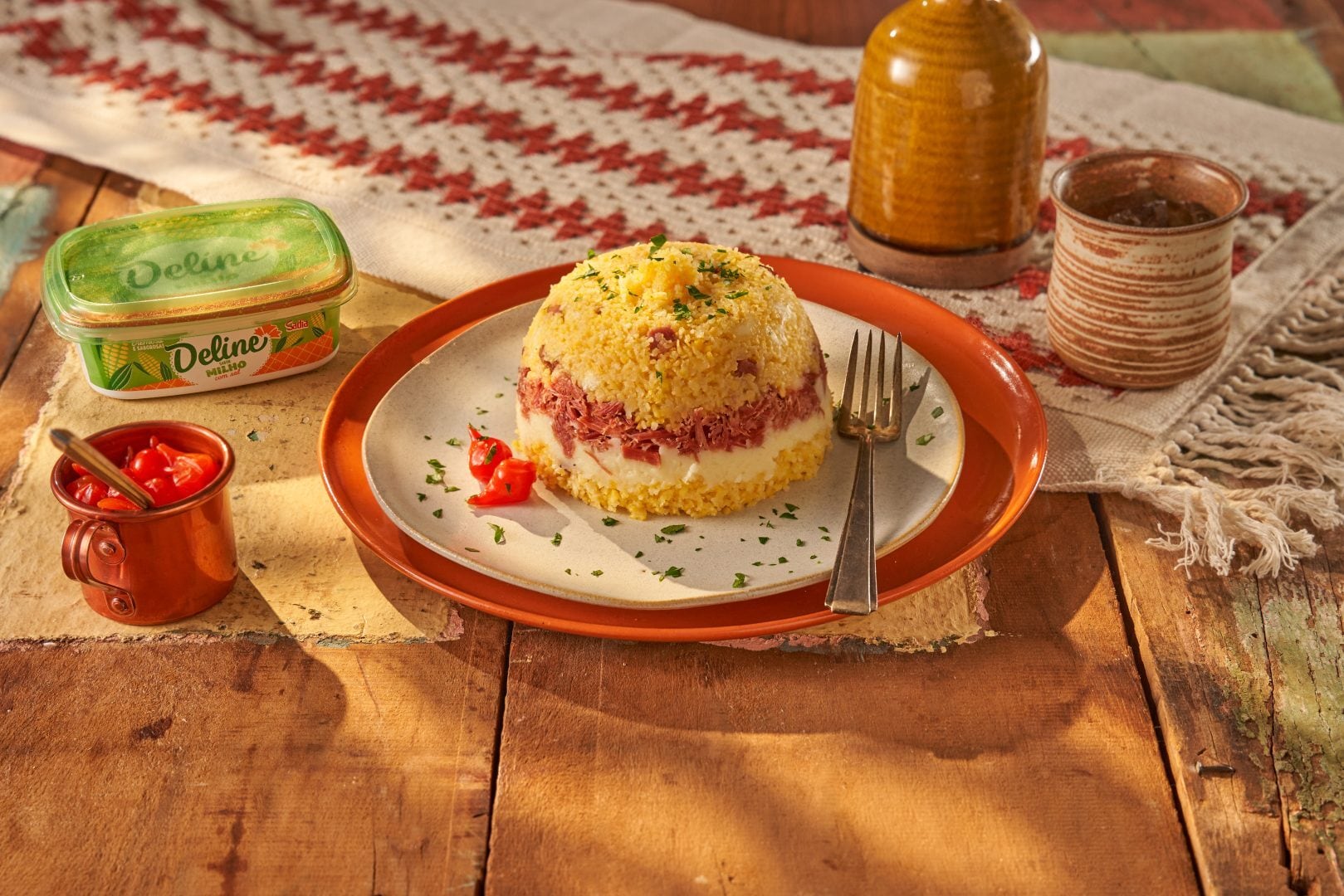 Coloque camada de carne seca e por cima dela, uma camada de queijo tipo catupiry. Por último, coloque mais uma camada da massa do cuscuz e leve para cozinhar por cerca de 5 a 10 minutos na cuscuzeira.