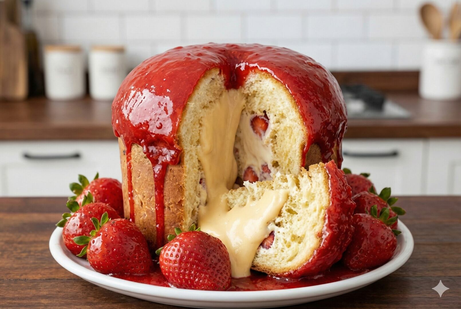 Finalização: Retire a calda do fogo e despeje imediatamente sobre o panetone, cobrindo o topo e deixando escorrer pelas laterais. Decore com morangos frescos ou banhados na própria calda antes que ela endureça. Espere secar e sirva.
