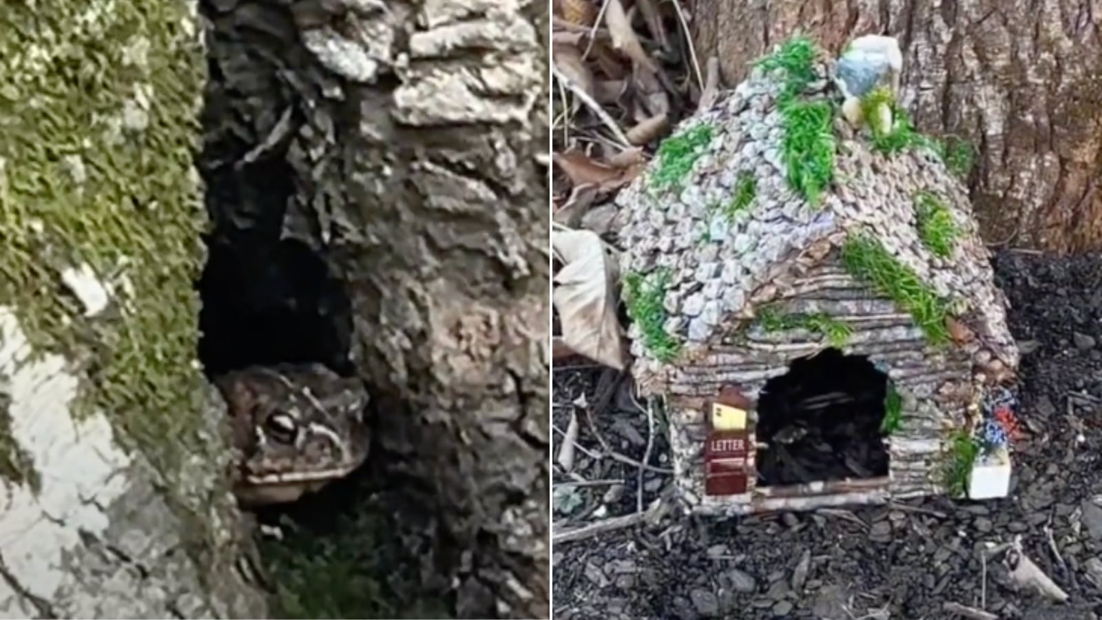 Tudo começou quando o cachorro da casa encontrou o sapo escondido na árvore. A partir daí, Sara e Theo resolveram transformar o buraco em uma pequena casa para o animal. O espaço ganhou piscina, mini jardim, plantas e até luzes de fada, que ajudam a atrair insetos – o prato preferido do Sr. Toad.