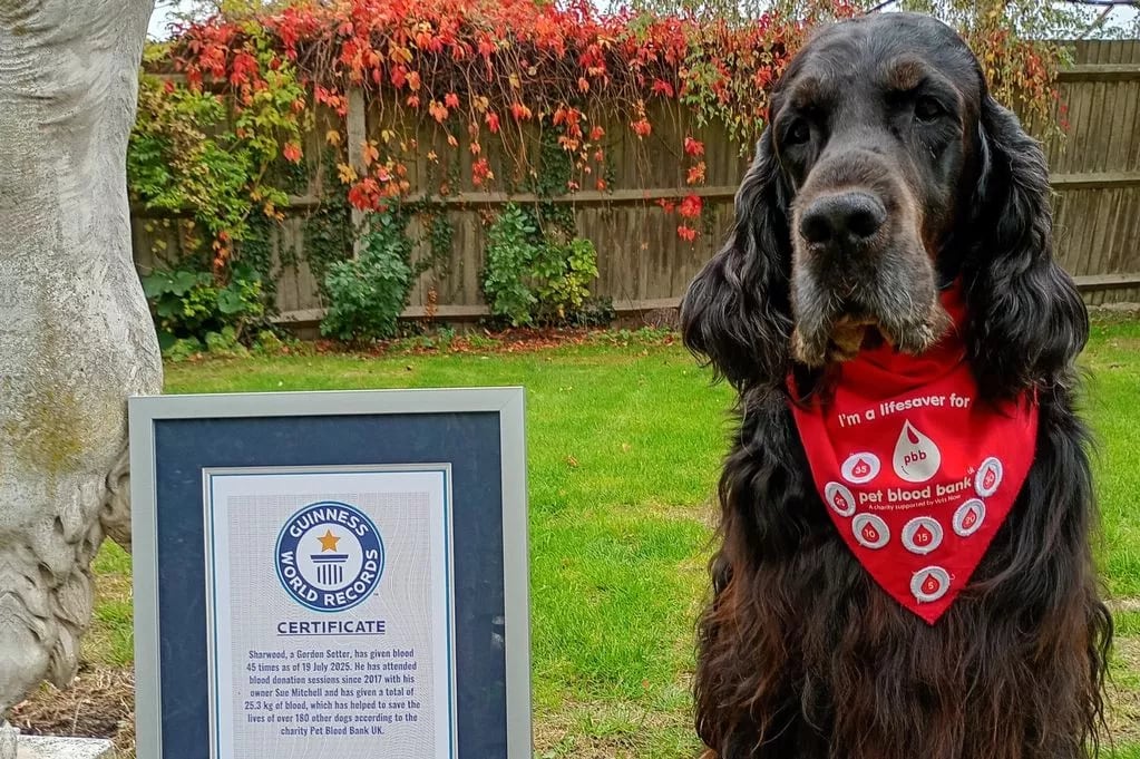 Sharwood, um setter gordon de nove anos, entrou para o Guinness World Records por realizar o maior número de doações de sangue por um cão, contribuindo para salvar quase 200 vidas caninas antes de se aposentar. O animal doava para o Pet Blood Bank cerca de seis vezes ao ano.