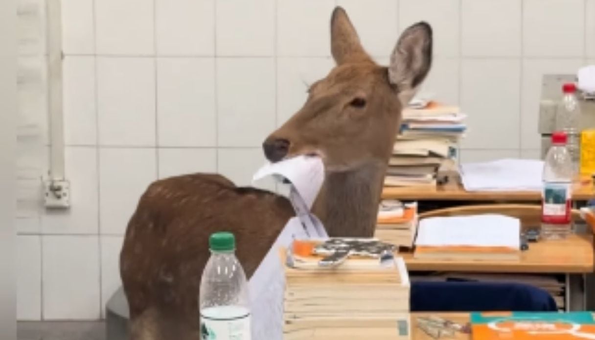 Um episódio inusitado chamou a atenção na cidade de Deyang, na província chinesa de Sichuan. Um pequeno cervo criado dentro de uma escola invadiu uma sala de aula e começou a mastigar as provas dos alunos.