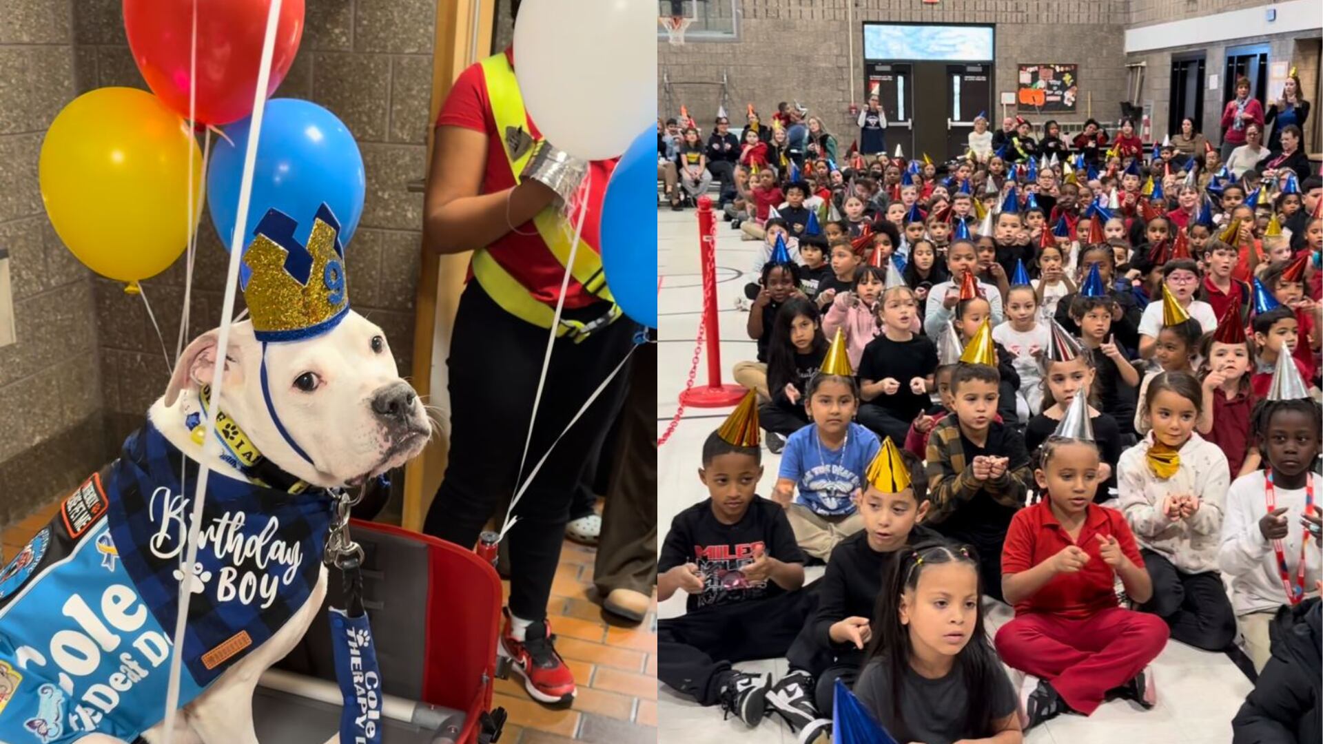 Uma escola em Nova Jersey, nos Estados Unidos, fez uma festa de aniversário para comemorar os 9 anos de Cole, um cão de terapia surdo. O evento contou com um bolo especial para o pet e parabéns em linguagem de sinais.