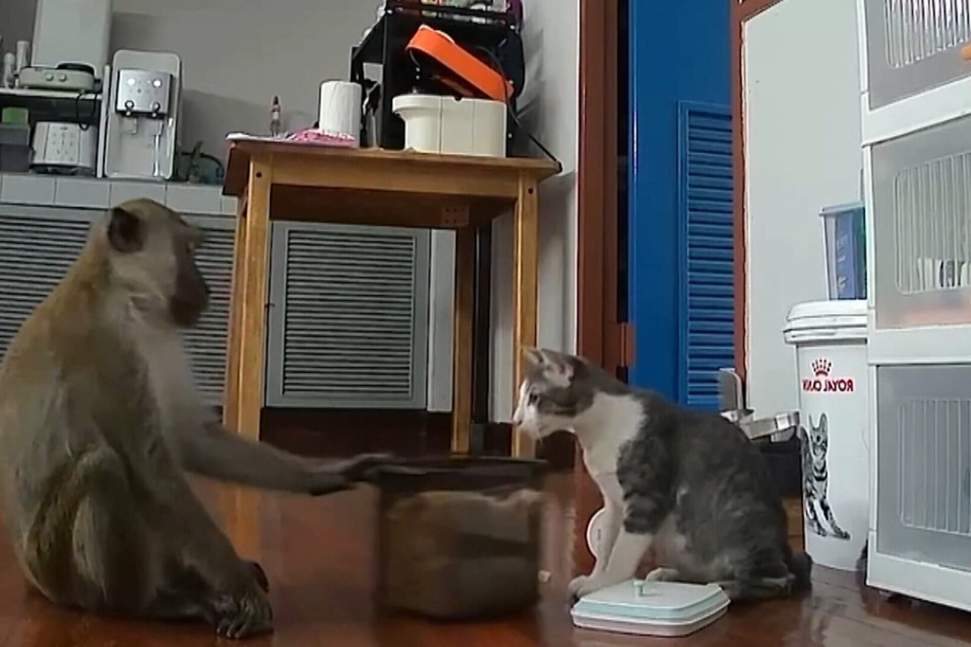 Por um breve momento, os animais chegaram a compartilhar a comida, mas a paz do pet da casa acabou quando outro bando de primatas entrou no local