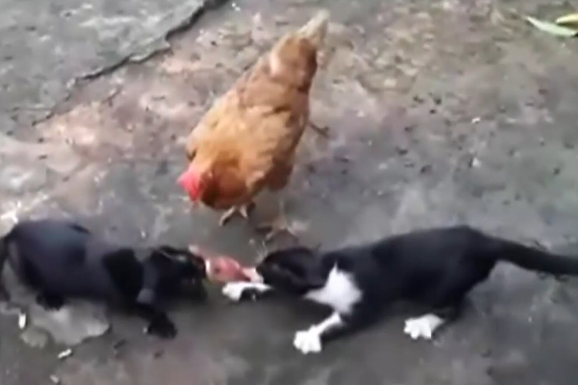 Em clima de ‘A Fazenda', galinha vira 'árbitro' durante disputa de gatos por pedaço de carne