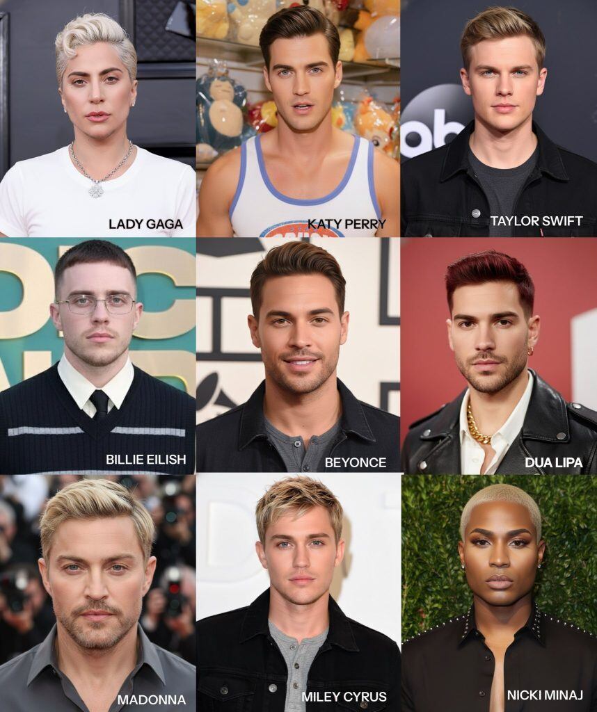 Nas imagens, que circulam na internet, é possível ver Lady Gaga com um visual bad boy de cabelo platinado curto e maxilar marcado. Já a cantora Katy Perry surge com um estilo clássico americano, enquanto Taylor Swift foi transformada em um típico galã de filmes adolescentes, mantendo os traços suaves.