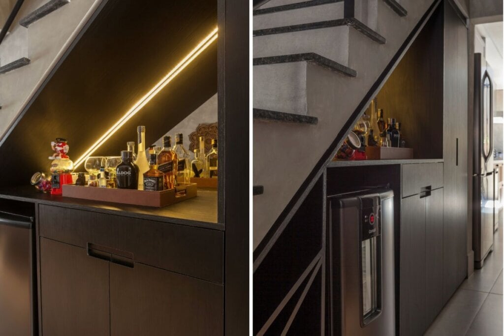O espaço formado abaixo da escada foi o local perfeito para acomodar a bandeja de bebidas. Isso foi possível graças à marcenaria executada sob medida e que acomodou a cervejeira e os armários onde estão guardados os copos e itens da sala de jantar.