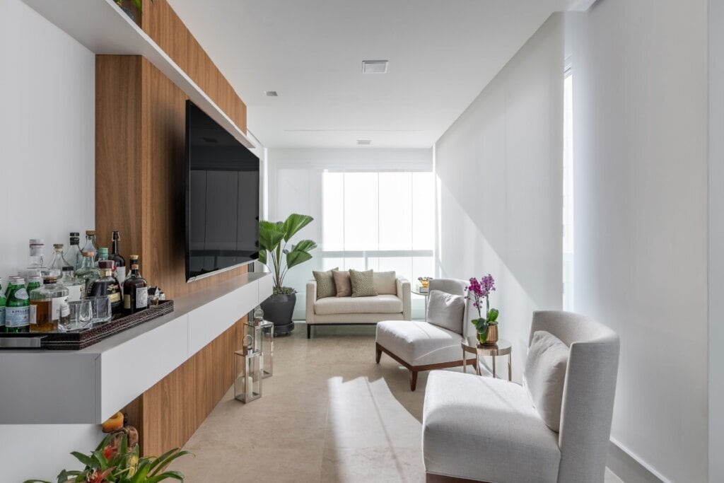 À primeira vista, o ambiente parece uma antessala antes da mesa de jantar posicionada na varanda. Mas, por aqui, a profissional deixou o local ainda mais agradável com o bar, um telão embutido com projetor e a estrutura de som embutida no forro, transformando a área no clima de cinema.