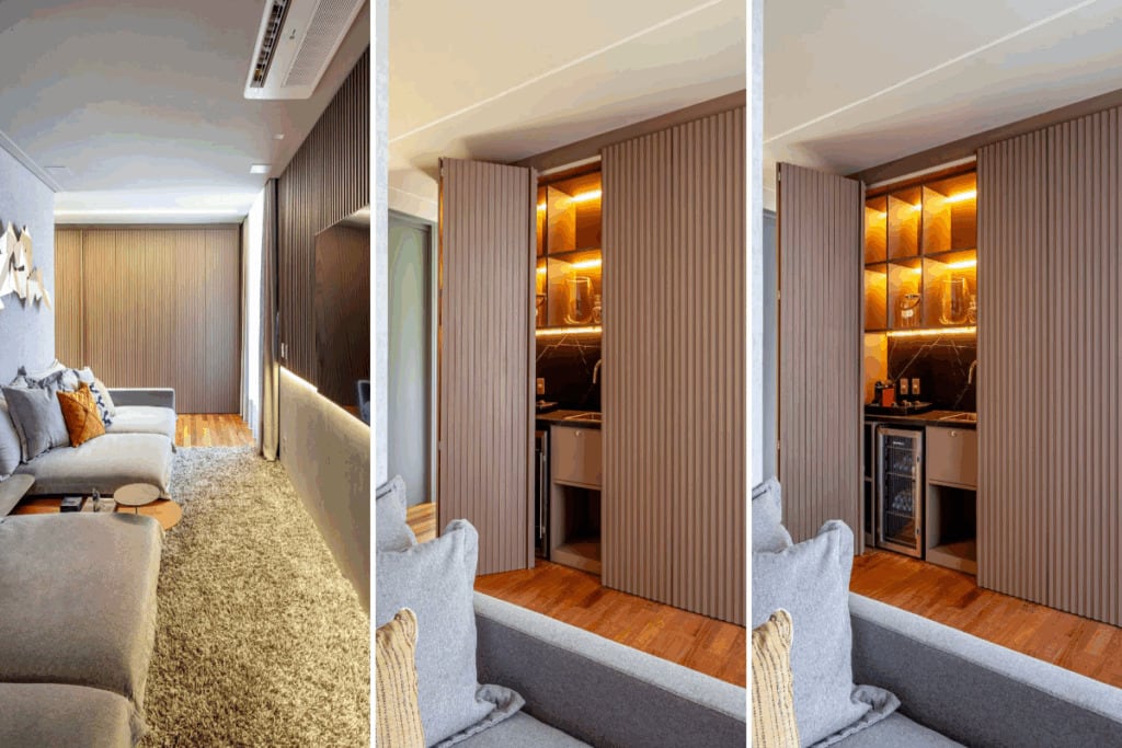Embora o bar tenha sua presença associada às áreas sociais, ele também pode compor ambientes que entregam uma experiência mais íntima aos seus moradores. Foi assim que Cristiane Schiavoni o executou no segundo andar de uma residência. Ao invés de mantê-lo sempre aberto, por aqui ela optou pela discrição ao ocultá-lo atrás das folhas das portas que acompanham o efeito ripado que faceia uma das laterais do ambiente. “Embora camuflado, o bar ficou muito elegante com as fitas de LED embutidas nos nichos”, analisa.