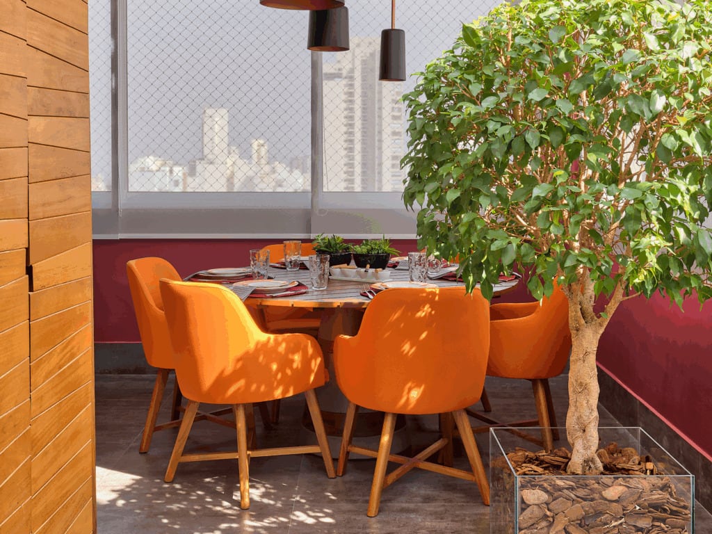 Nas áreas sociais, o laranja costuma reforçar as sensações de acolhimento e convivência, enquanto em espaços de trabalho ou estudo coopera para criatividade e disposição. Ainda assim, Cristiane Schiavoni destaca que a cor não está restrita ao uso em grandes proporções, já que, dependendo do projeto, pequenos elementos já são suficientes para inserir o tom de maneira requintada.