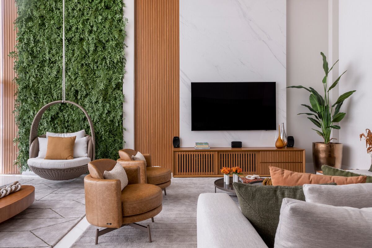 Entre as possibilidades a serem exploradas, espaços maiores possibilitam a criação de jardins verticais que tanto influenciam na estética como podem ajudar em questões acústicas da área. “Em projetos com pé-direito duplo, gosto muito de considerar as espécies nas salas [de estar, TV] e varandas integradas. Eu acredito nessa combinação entre biofilia e bem-estar”, reforça a arquiteta.