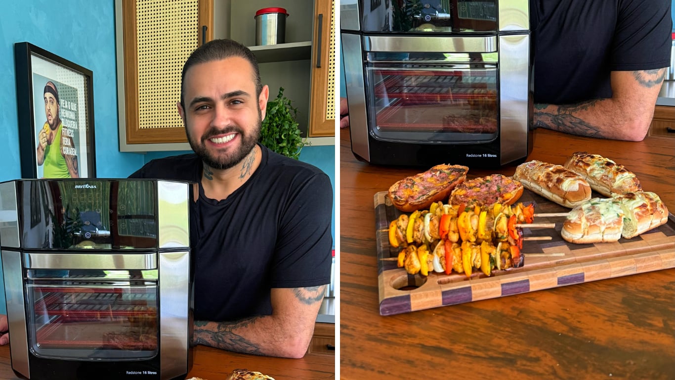 Não é só batata frita! Com a Air Fryer Oven 16L da Britânia, você pode preparar um churrasco completo de uma só vez. Confira abaixo como fazer pão de alho, choripan e espetinhos de frango, tudo assando junto.