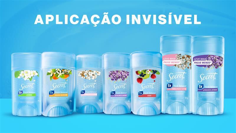 Além disso, Secret proporciona 48h de proteção, sensação de frescor e conforto, elimina os fortes odores e conta com fragrâncias suaves que vão do floral ao cítrico, passando por opções como lavanda, algodão, berry, jasmim e flor de laranjeira.