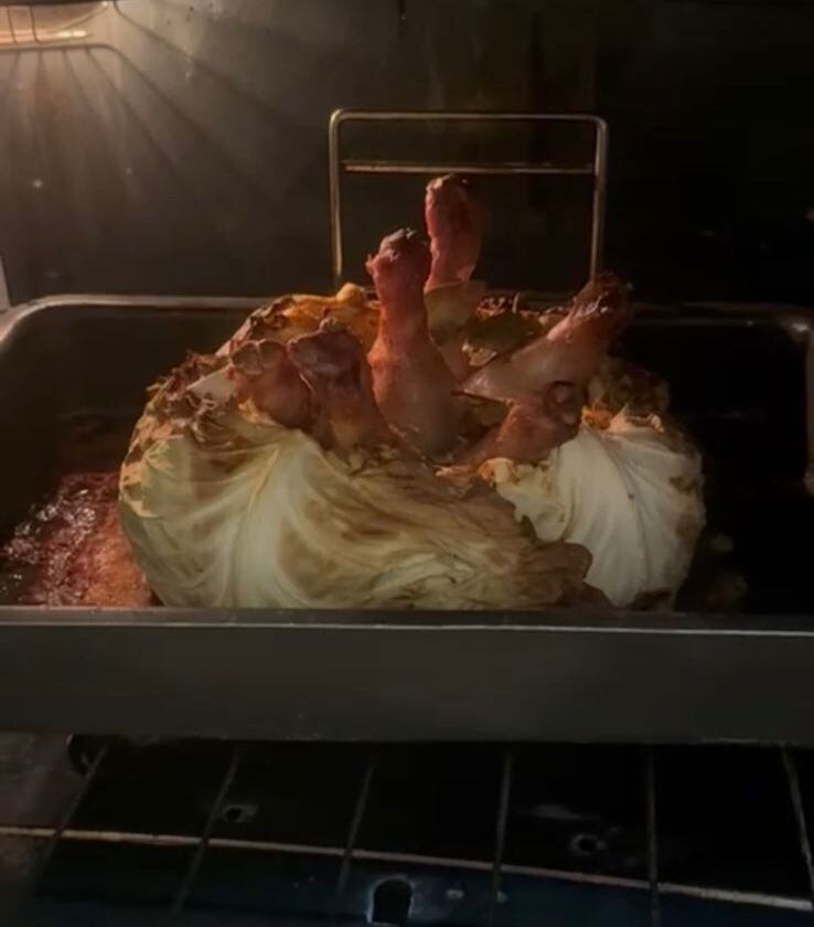 O que não me pareceu factível: assar o frango com leite dentro do repolho, mas aí eu descobri várias receitas desse jeito (veja abaixo). E, em todos os vídeos, o frango saia dourado e crocante. Isso é realmente o impossível. O frango é cozido dentro da cavidade do repolho, que funciona como uma panela alta. Impossível ficar crocante.