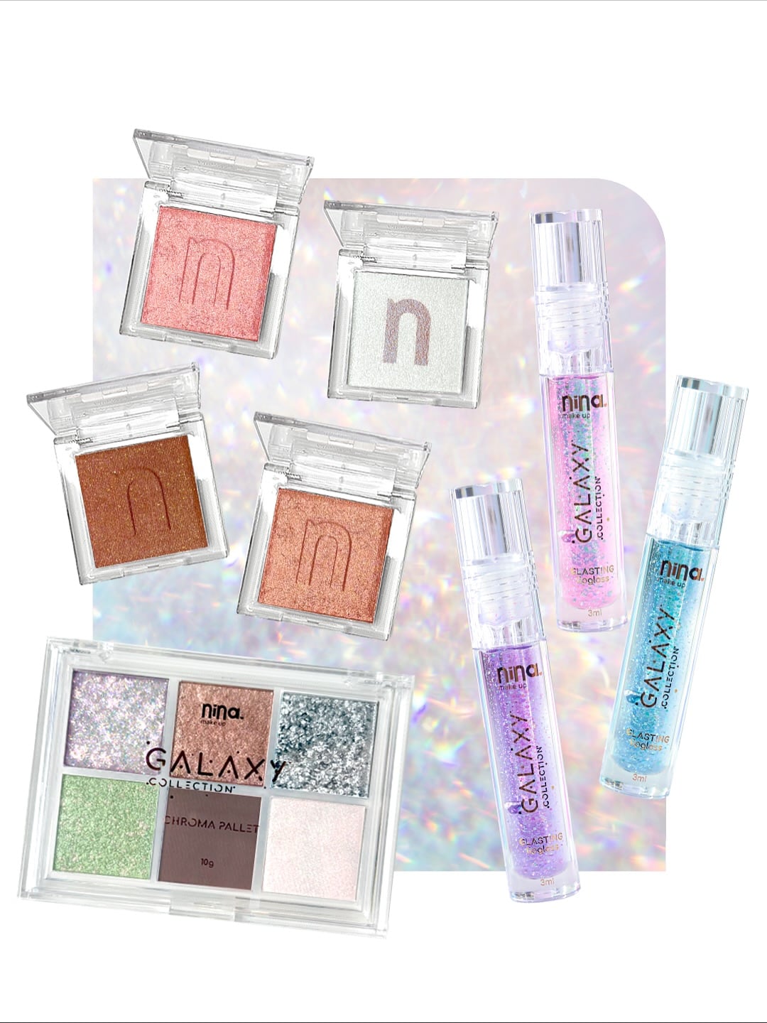 A Nina MakeUp apresenta a coleção Galaxy, marcada por muito brilho e efeito cósmico. A linha inclui paleta de sombras, blush, iluminador e gloss, todos com alta pigmentação e acabamento brilhante.