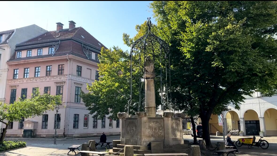 Logo de início, Iacopo nos contou a origem do nome da cidade e o significado do urso no brasão de Berlim. Essa história está ligada ao Nikolaiviertel, o bairro mais antigo da cidade, onde uma fonte ornamentada mostra um urso segurando um escudo. O animal simboliza tanto os ursos que habitavam a região nos séculos passados quanto o nobre guerreiro Albrecht I, conhecido como Albrecht der Bär (“Albrecht, o Urso”), fundador do principado de Brandemburgo.
