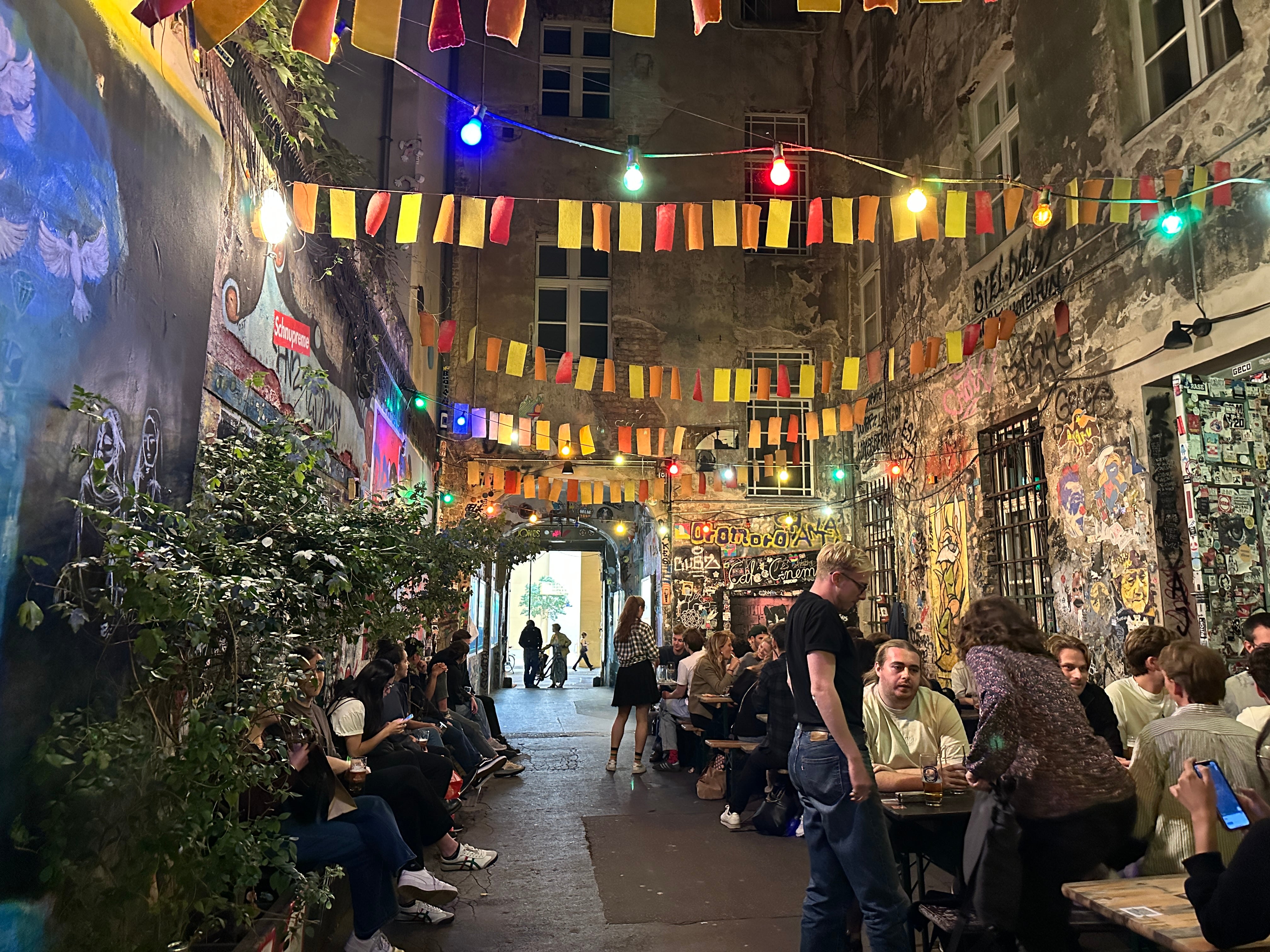 Berlim à noite é uma mistura vibrante de bares, baladas e espaços culturais que tornam a cidade única. Como fã de barzinhos charmosos, aproveitei para explorar alguns lugares imperdíveis. No Eschschloraque Bar, a experiência é totalmente diferente — o bar fica dentro de uma galeria de arte aberta, com atmosfera criativa e alternativa. Próximo à região do metrô Weinmeisterstraße, o Café Cinema, ao lado da Galeria Kino Central & Open Aire Mitre, é perfeito para drinks descontraídos.