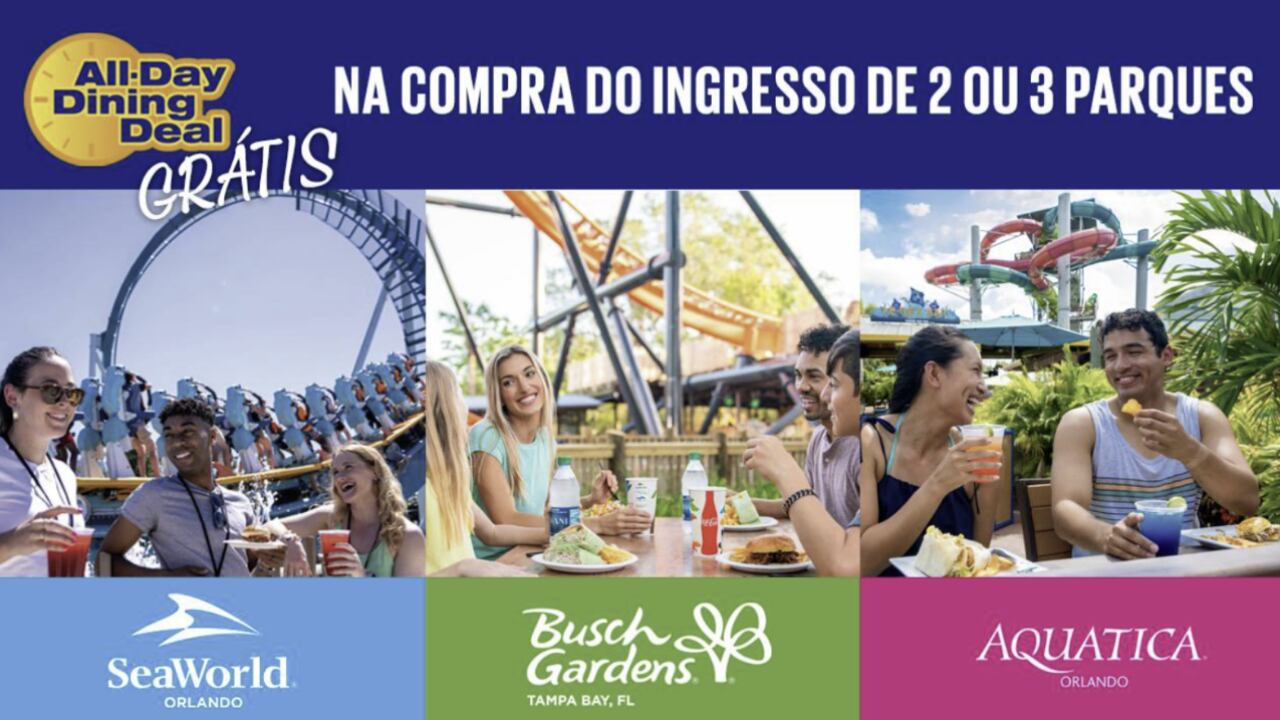 Inclusive, a United Parks & Resorts (SeaWorld, Busch Gardens e Aquatica) está com uma promoção vigente que na compra de 2 ou 3 ingressos da rede - o All Day Dining sai de graça!!!