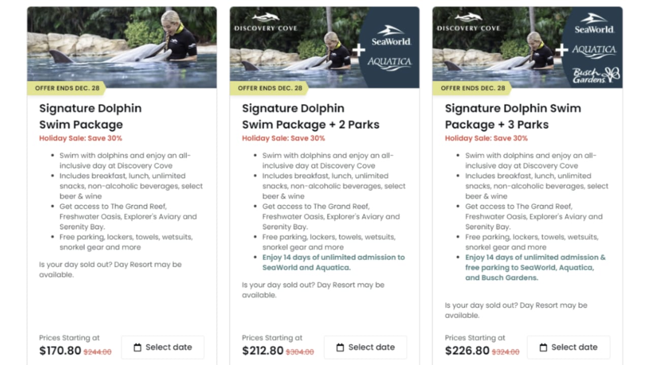 Para garantir o melhor custo-benefício, sempre opte pelo combo de parques do Sea World, que abrangem o SeaWorld, Busch Gardens, Aquática e o Discovery Cove. Para se ter uma ideia da economia, só o Discovery Cove sai por U$ 170 (já incluído o nado com golfinhos). Enquanto o combo com os três parques (podendo entrar livremente por 14 dias consecutivos) + o Discovery Cove fica por apenas U$ 226 (promoção válida até 28 de dezembro). Ou seja, você pode conhecer os outros três parques por 14 dias por U$ 56.