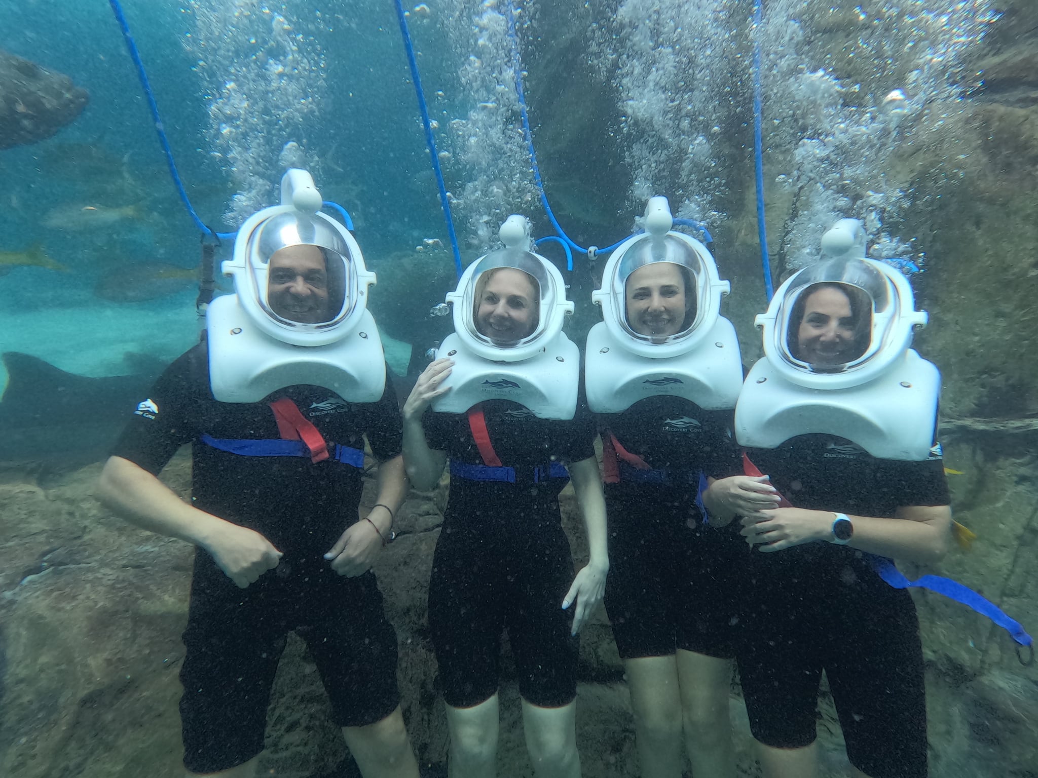 Eu fiz o SeaVenture, uma atividade à parte, com custo a partir de U$ 30 e, sinceramente, é uma das experiências mais inovadoras e surpreendentes do Discovery Cove, realizado no incrível The Grand Reef. Esse é um passeio subaquático com o uso de um capacete especial de mergulho (parece de astronauta), onde você consegue respirar normalmente e se sentir totalmente confortável debaixo d’água, mesmo sem ter nenhuma experiência prévia com mergulho.
