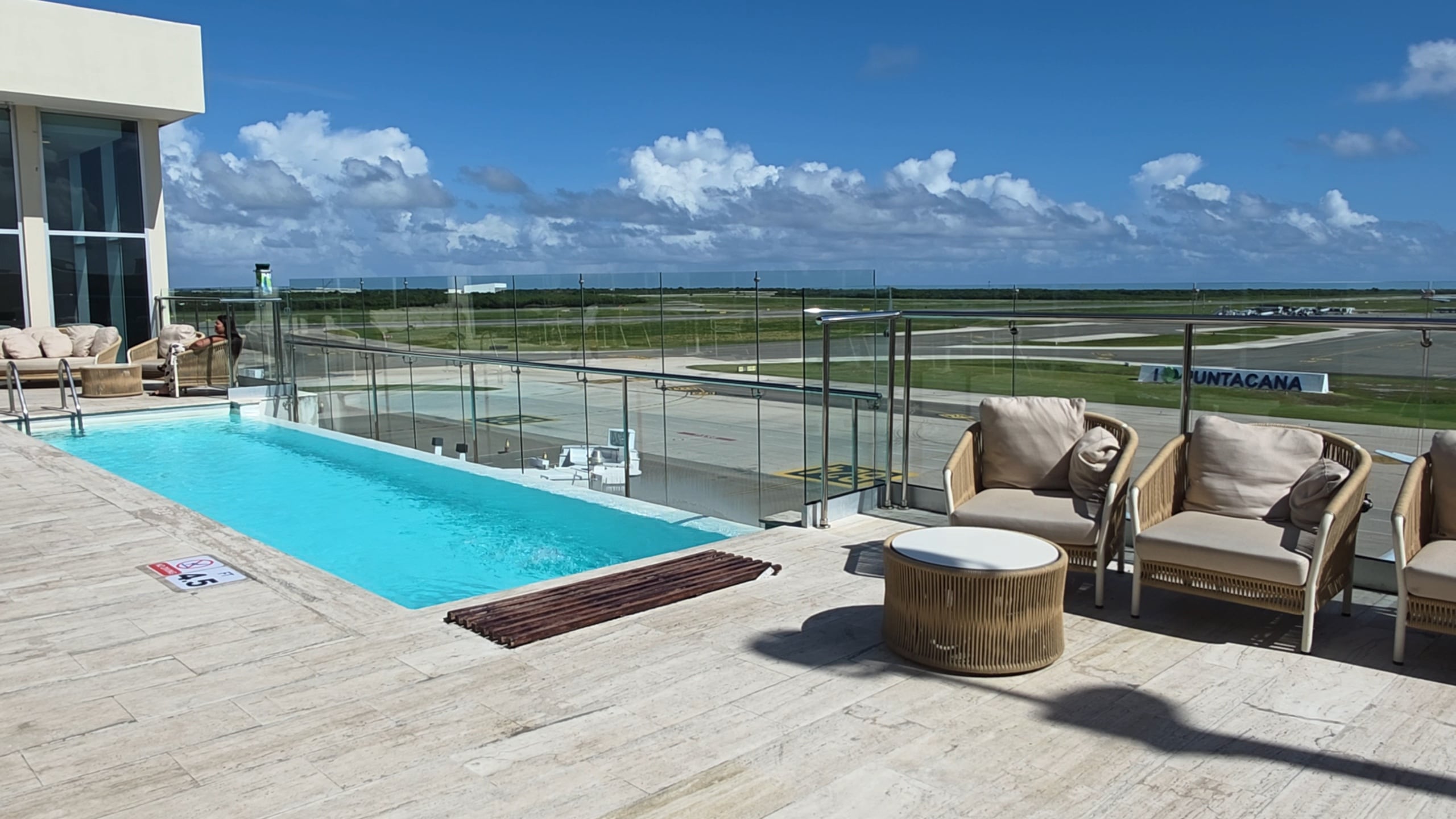 Quando desembarquei em Punta Cana e cheguei a tempo de pegar a sala VIP da conexão, confesso: me senti em férias de verdade antes mesmo de sair do aeroporto. A sala do Terminal B tem algo que praticamente não se encontra em nenhum outro lounge de aeroporto no mundo — uma piscina de borda infinita com vista para a pista de pouso, onde você pode relaxar, tomar sol e assistir os aviões decolando e aterrissando.