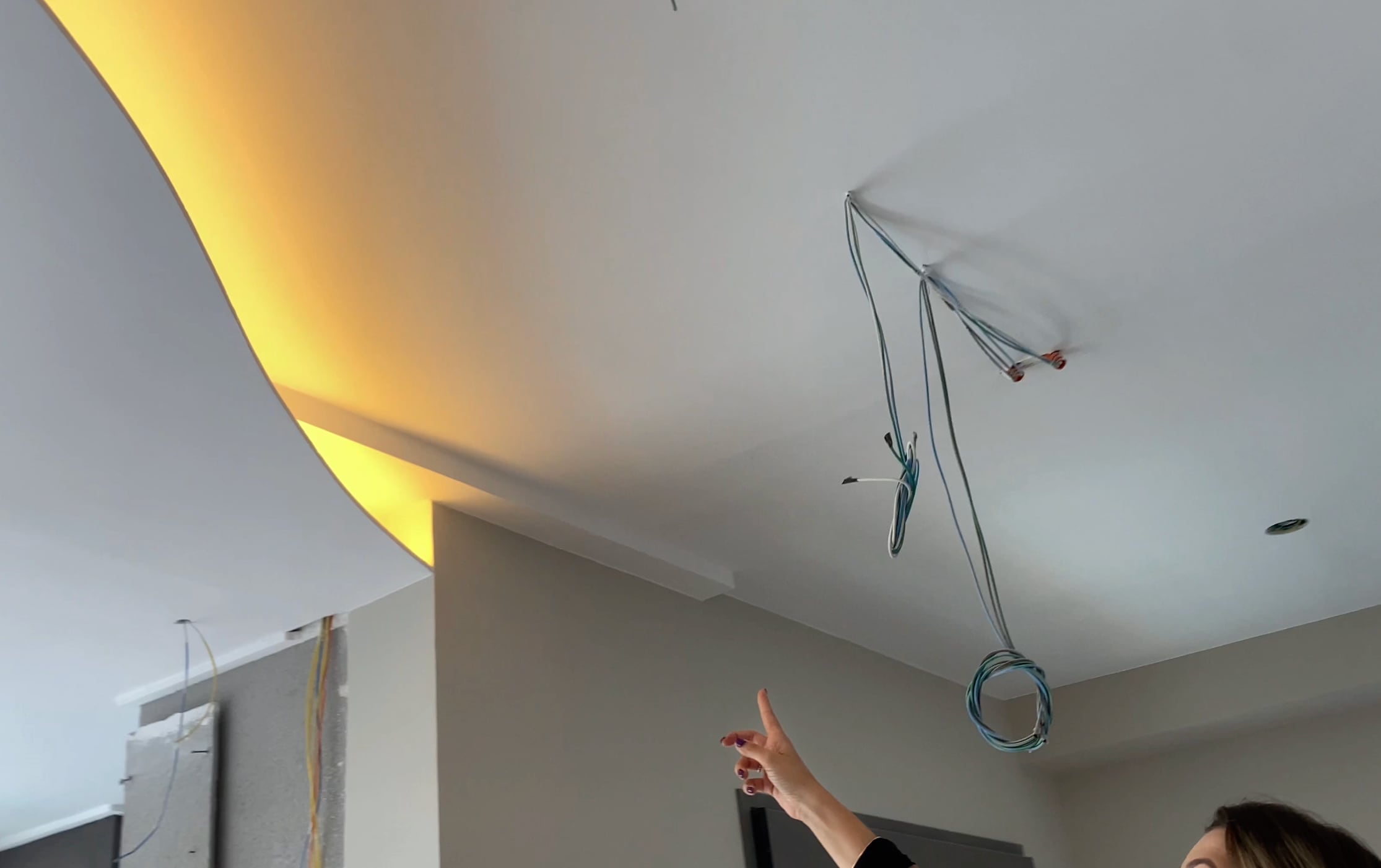 Em vez de rebaixar todo o teto, a opção foi trabalhar com a própria laje e usar iluminação pontual. “Se você rebaixa tudo, mais a marcenaria quando entrar, ia dar a sensação de que o apartamento é menor ainda.”